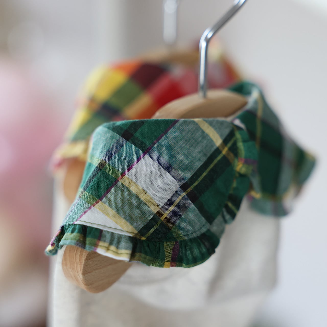 印象的なグリーン系とオレンジ系マドラスチェックのシャツ。