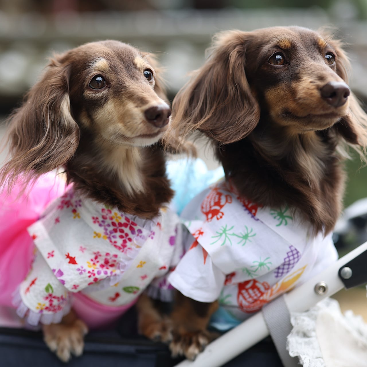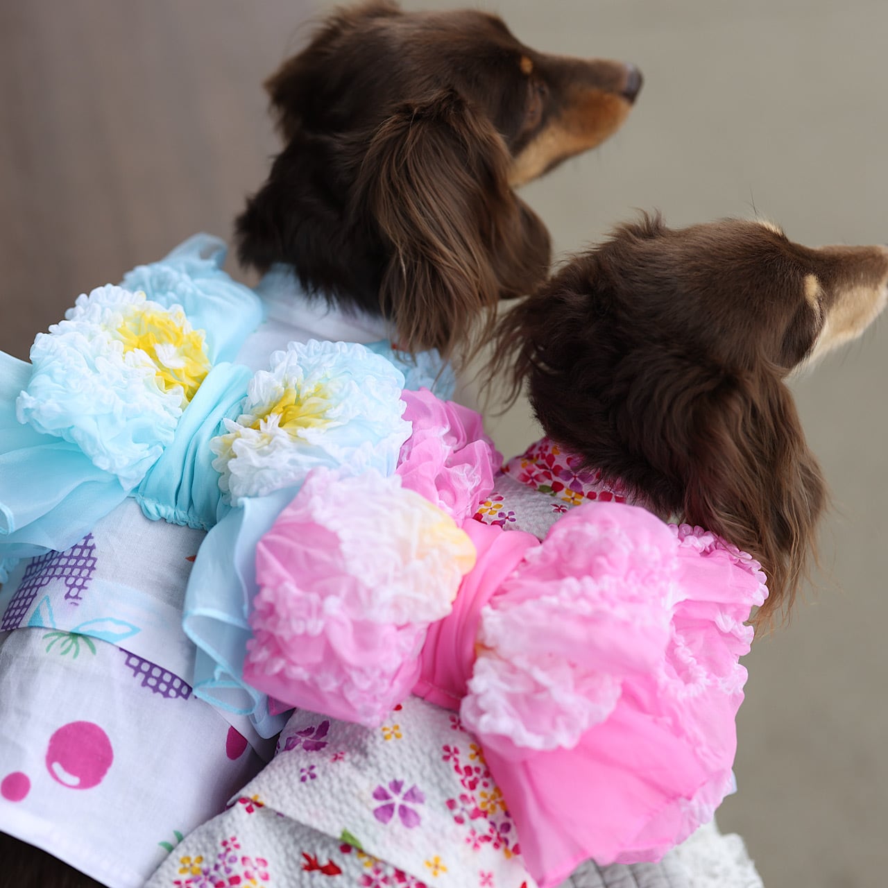 帯はどちらもつくり帯縫い付けタイプ。お腹でマジックテープをとじるだけで簡単に可愛く仕上がり、動いてもズレません。