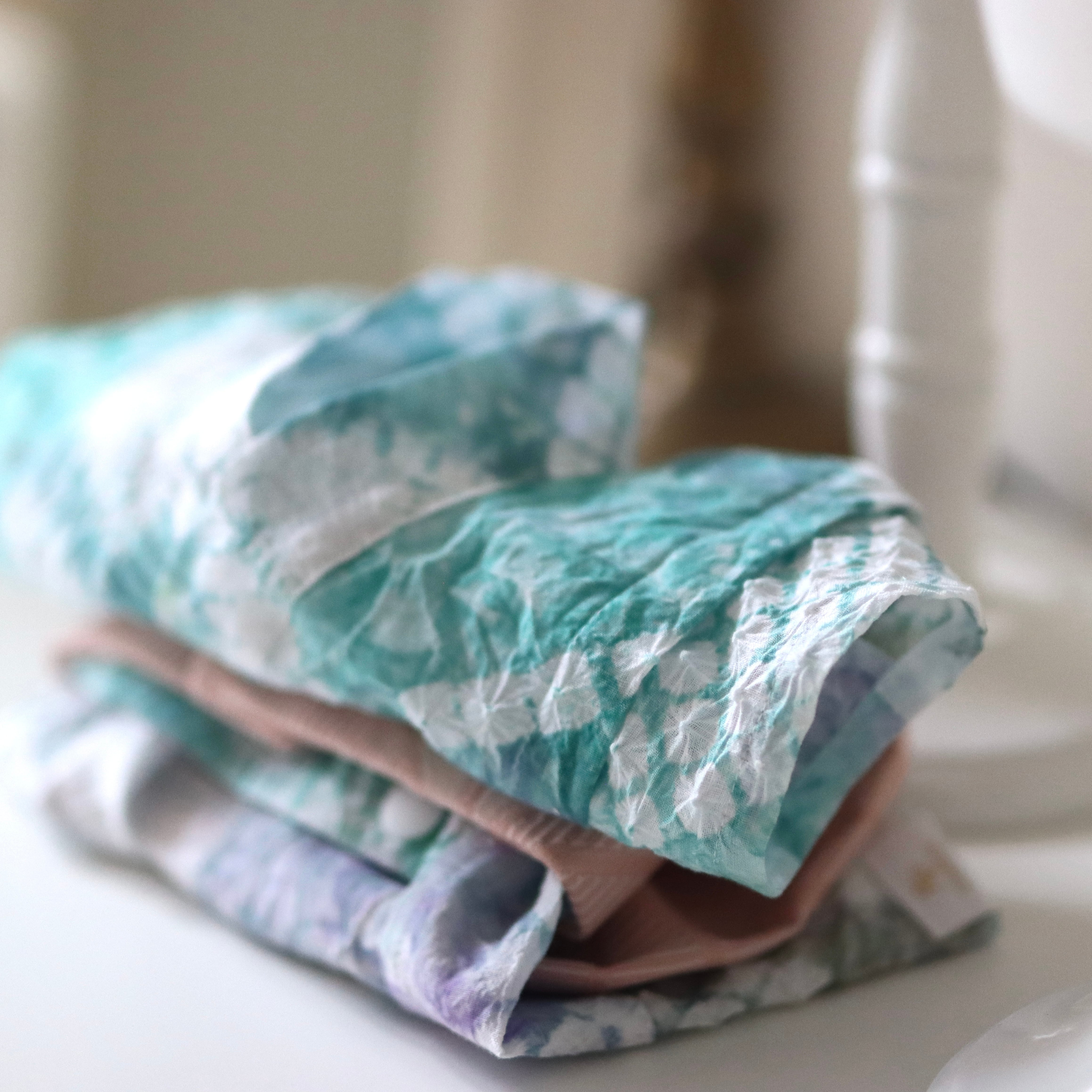グリーンやピンク、パープルが爽やかで、手染めの柔らかな色合いが素敵な絞りです。