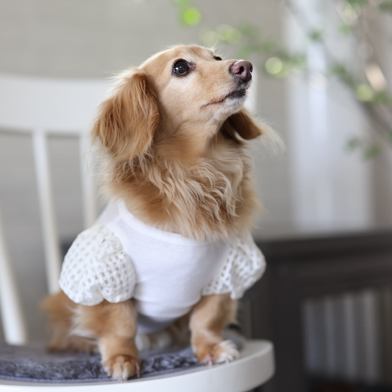 ダックスの体型に合わせた小ぶりパフながら、エアリーなボリュームを追求しています♥