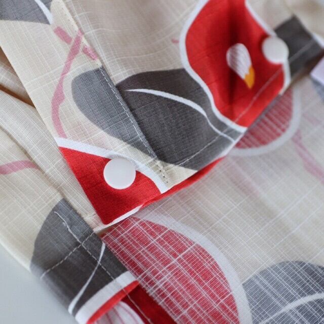 両腕をお袖に通し、胸の合わせを整え丸いマジックテープでとめます。