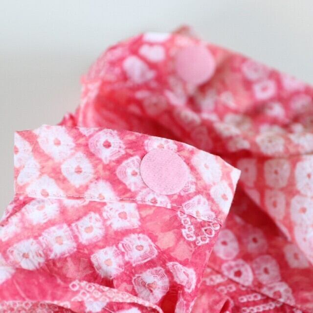 両腕をお袖に通し、胸の合わせを整え丸いマジックテープでとめます。