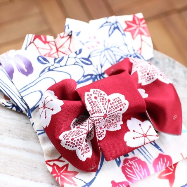 流水花の浴衣に合う赤と黄色で地模様はお任せ下さい。