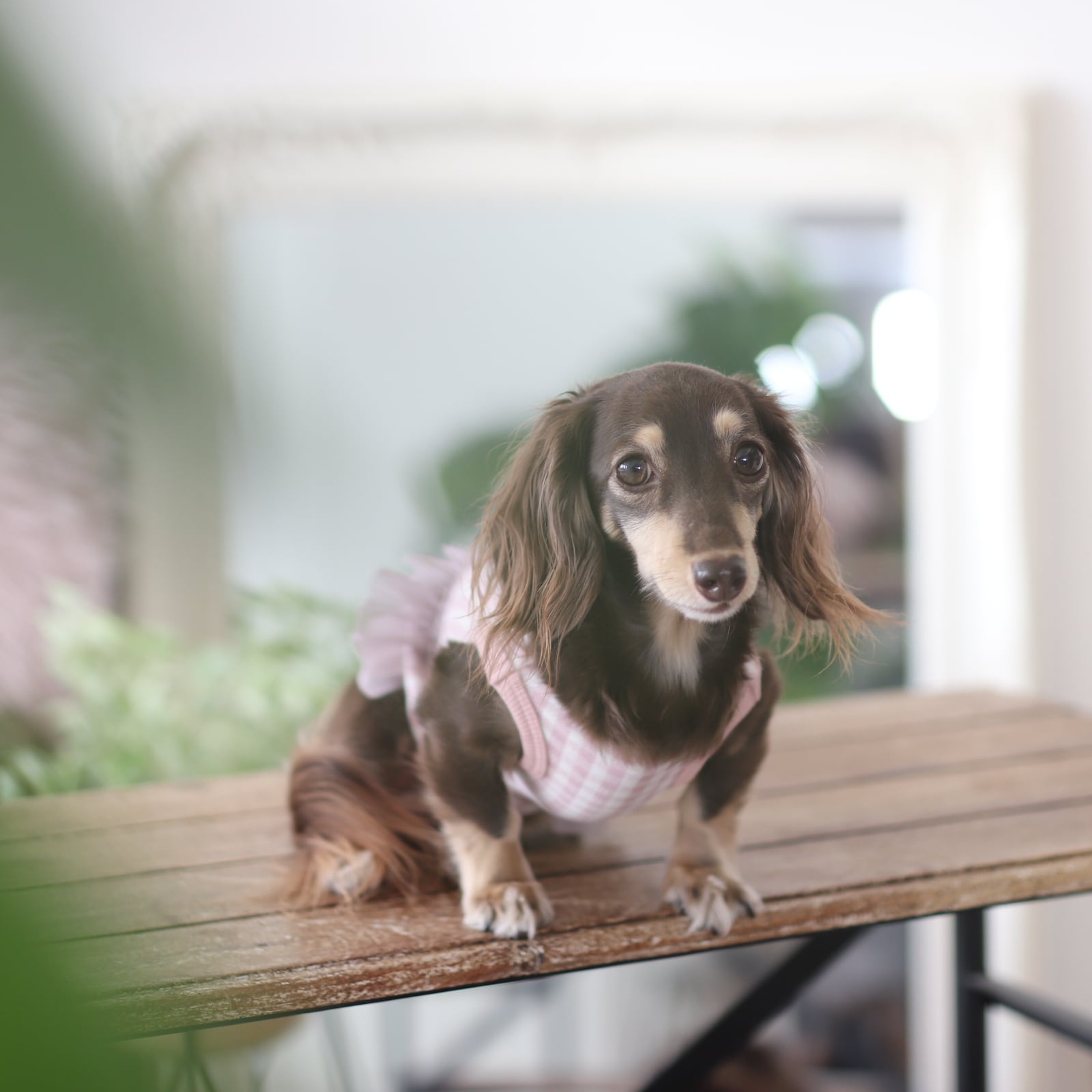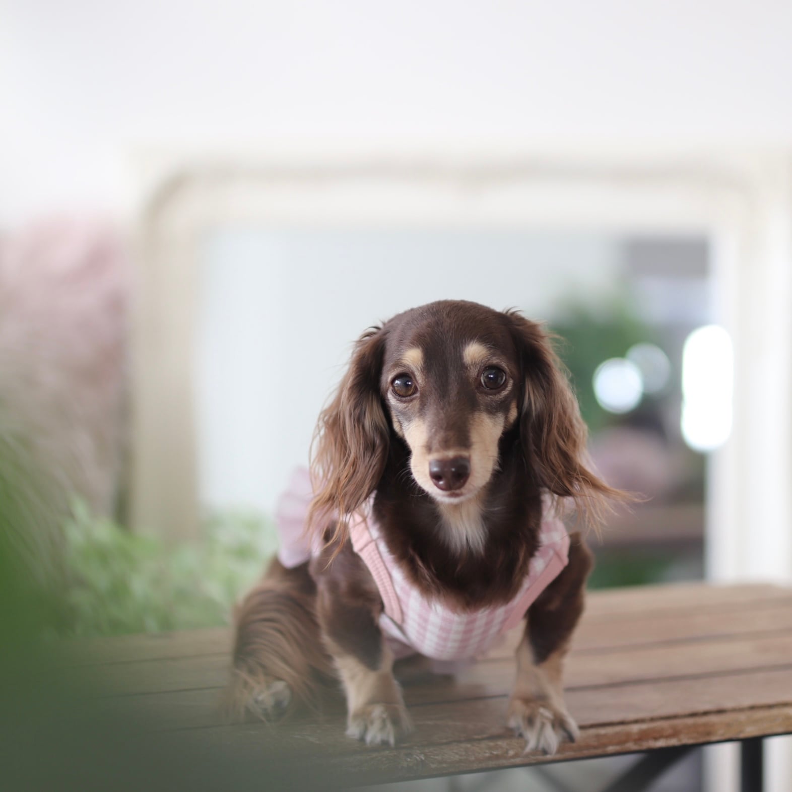 前脚を入れて上のスナップをパチン。後脚も入れて、下のスナップをパチン。