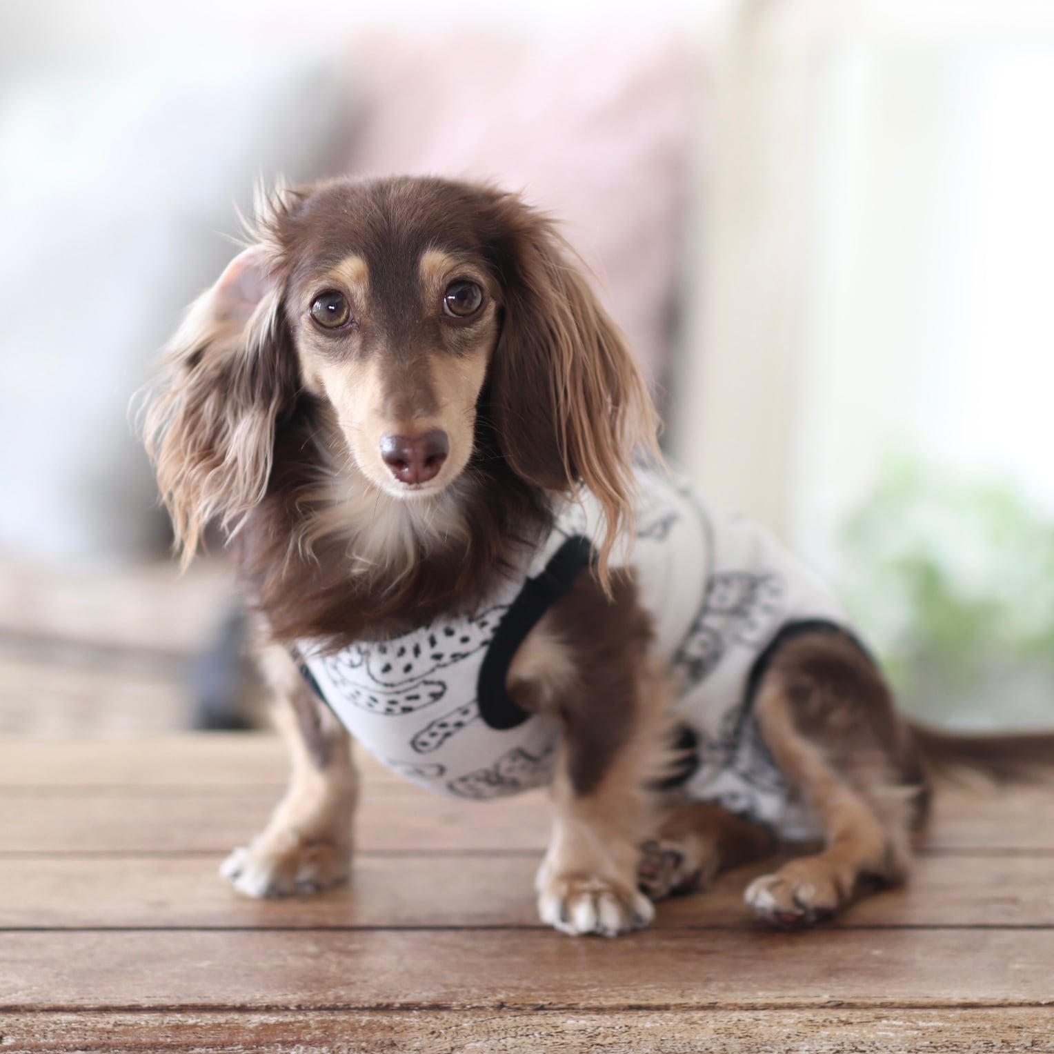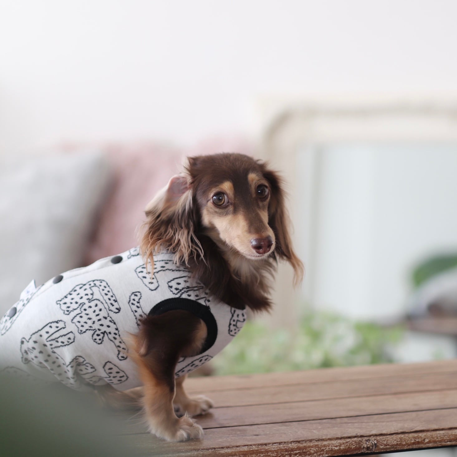 前脚を入れて上のスナップをパチン。後脚も入れて、下のスナップをパチン。