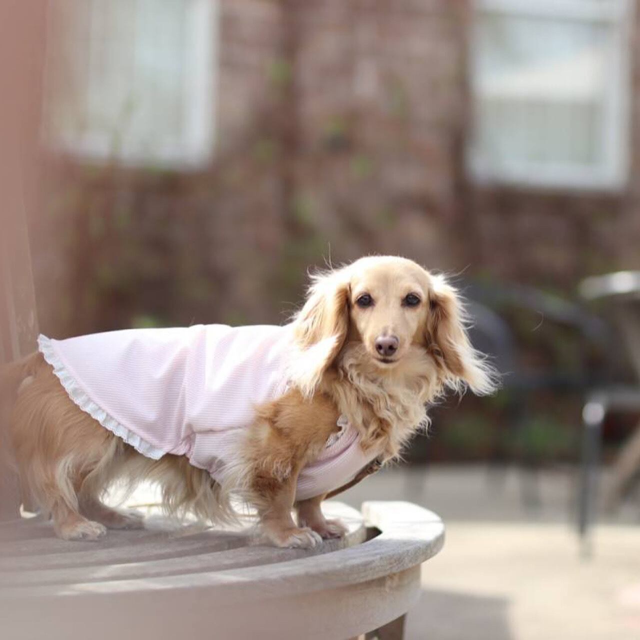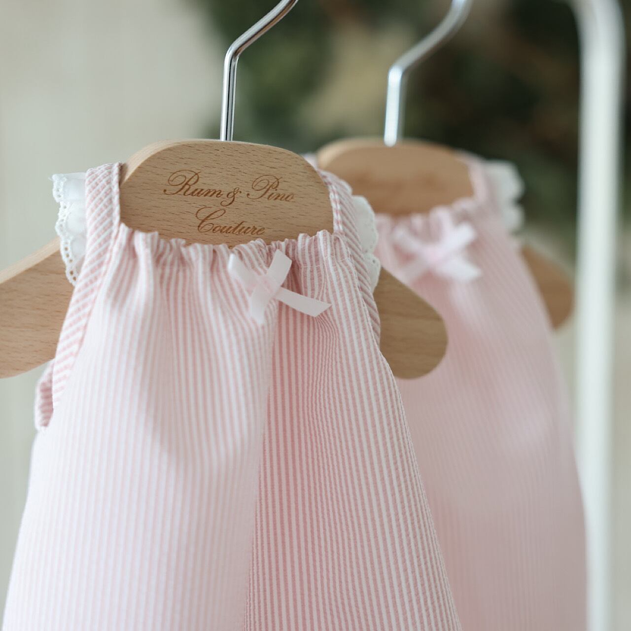 背中の華奢なリボン、優しいピンク色のストライプ、肩や裾のフリル、