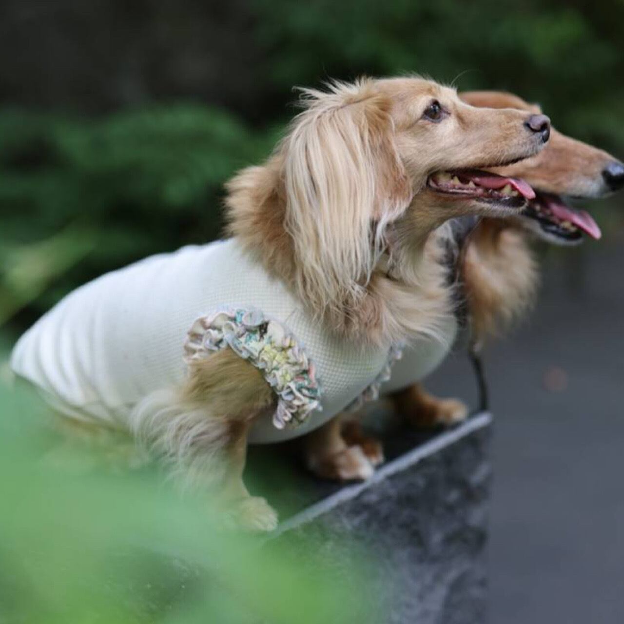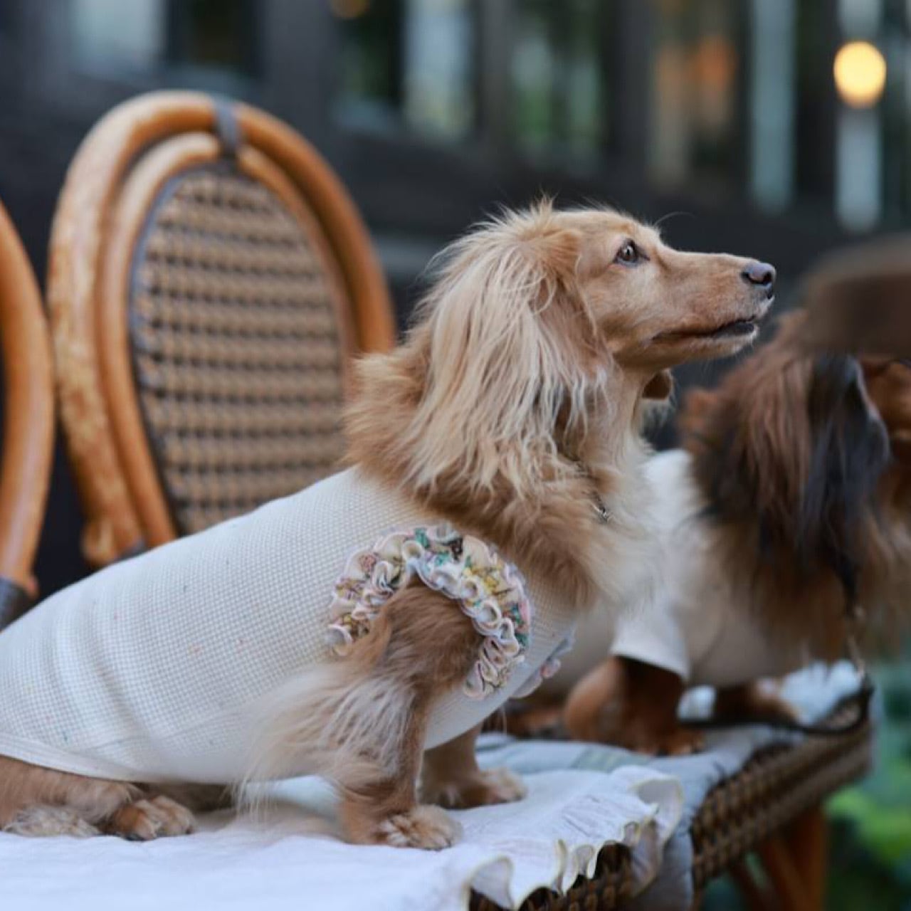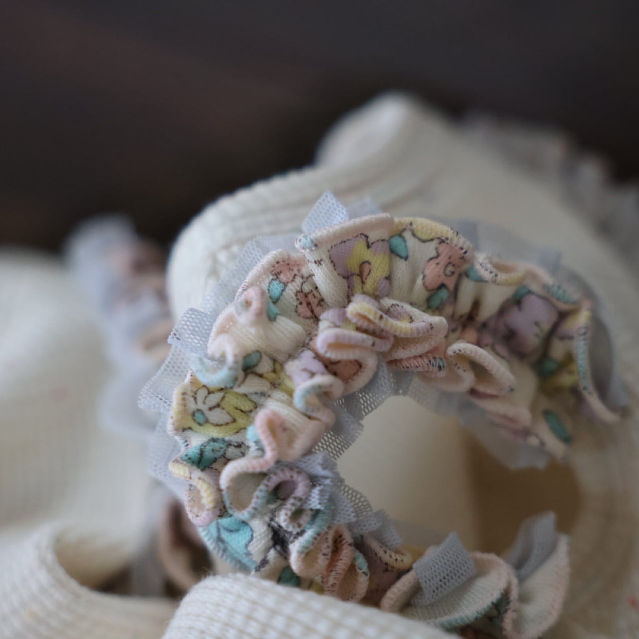 肩のフリルには、カラフルに描かれた柄ものを贅沢にあしらいました。