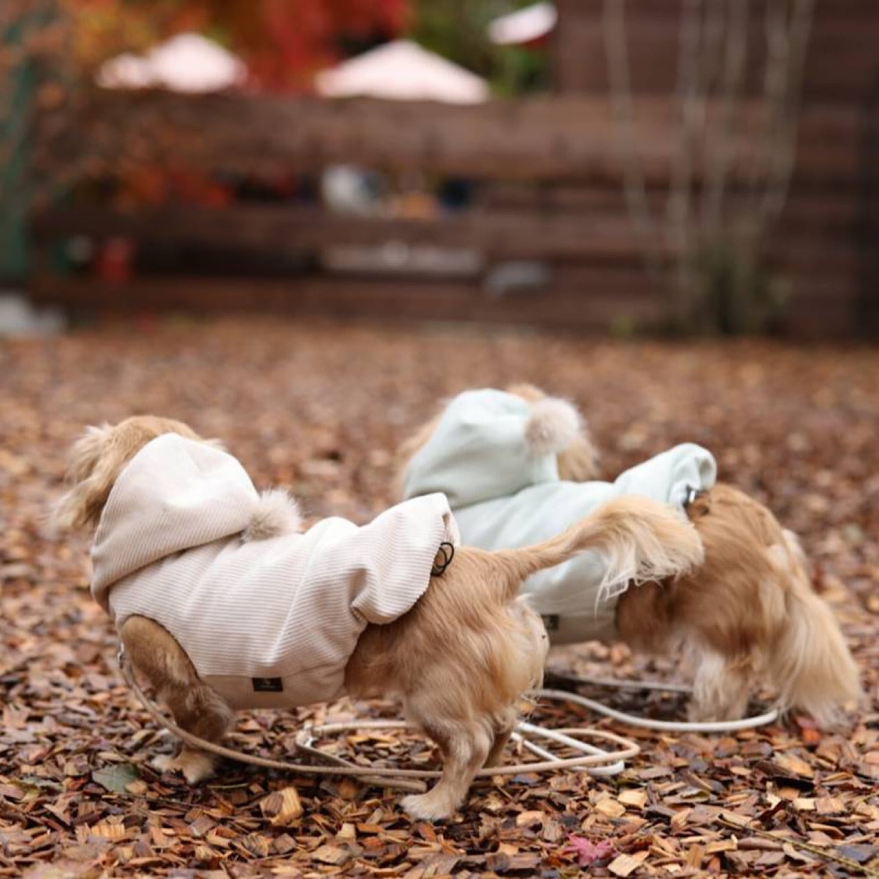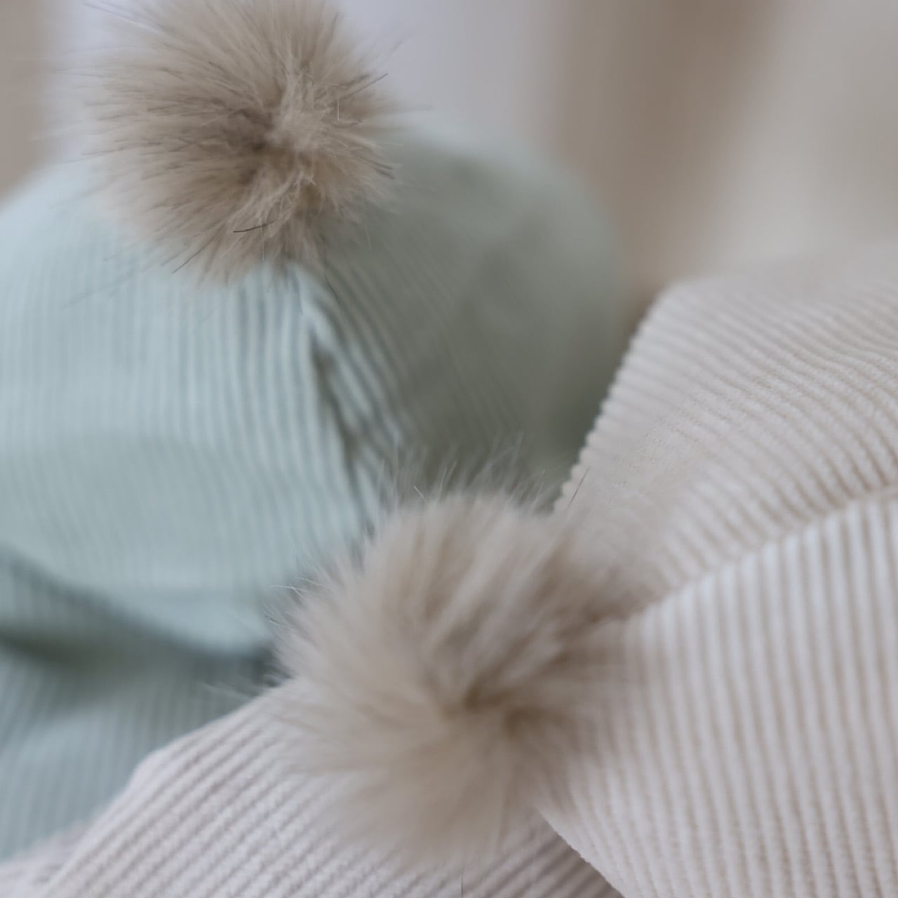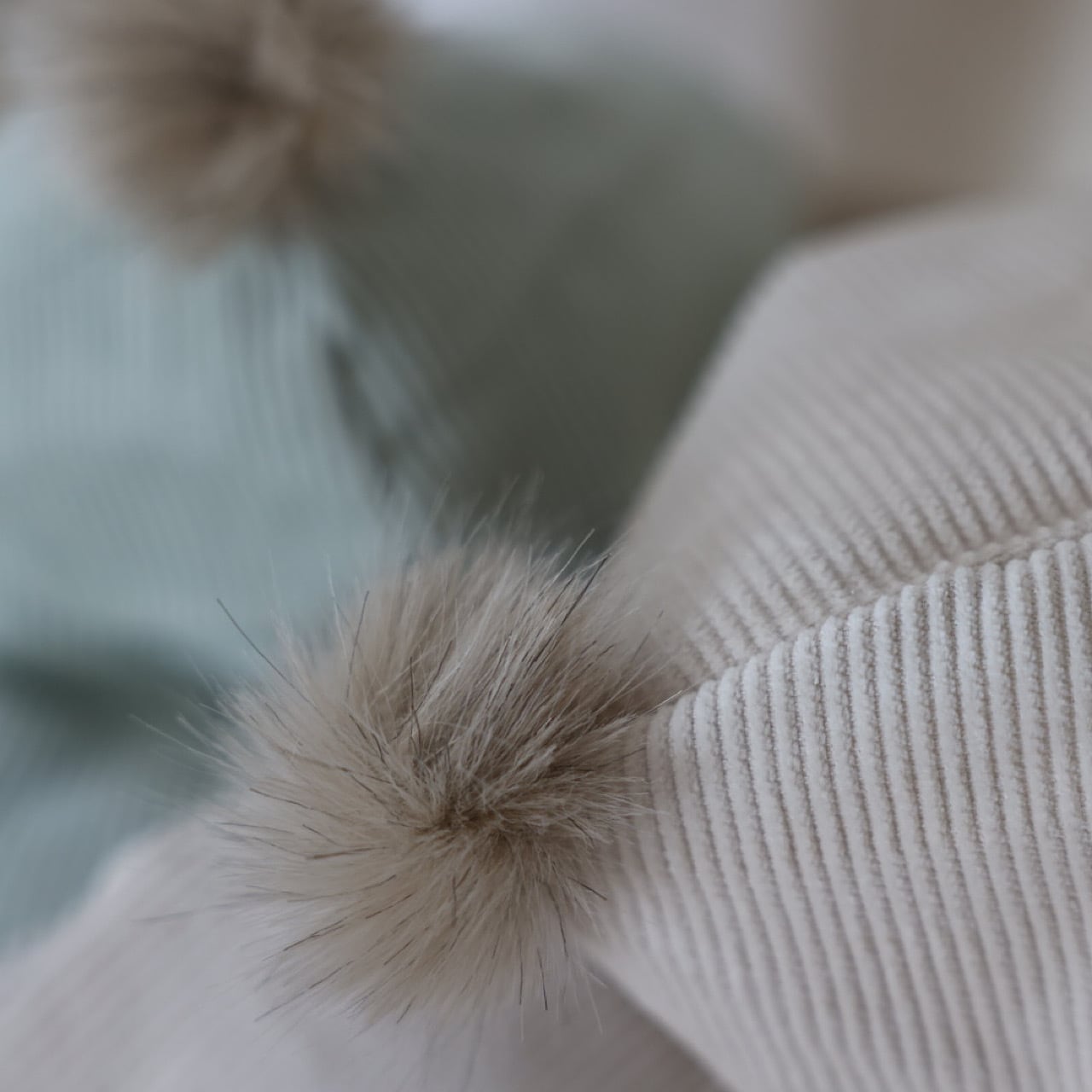 エコファーのグレージュぽんぽんが、ふわっと優しい雰囲気♡