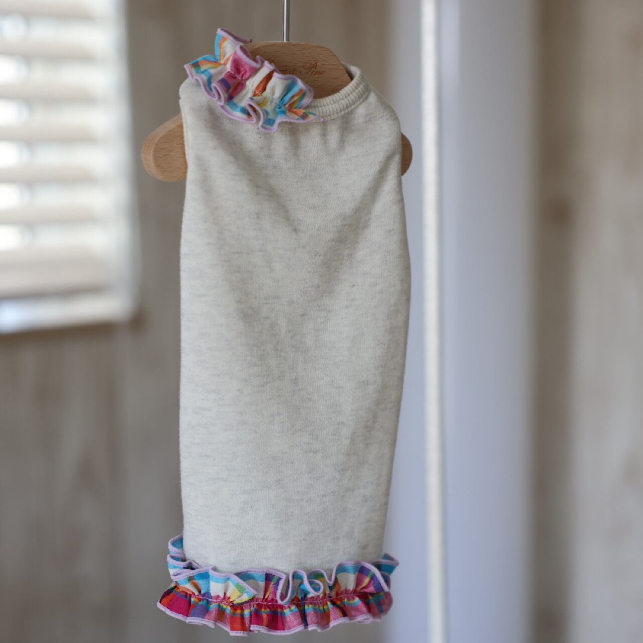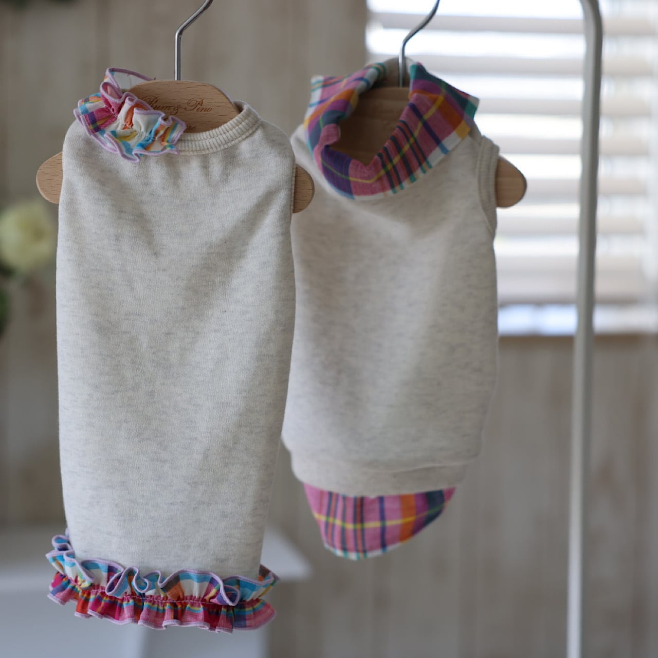 マドラスチェックらしい、ちょっぴりエキゾティックな色合いで、片方の首まわりにアシメプリプリ♪