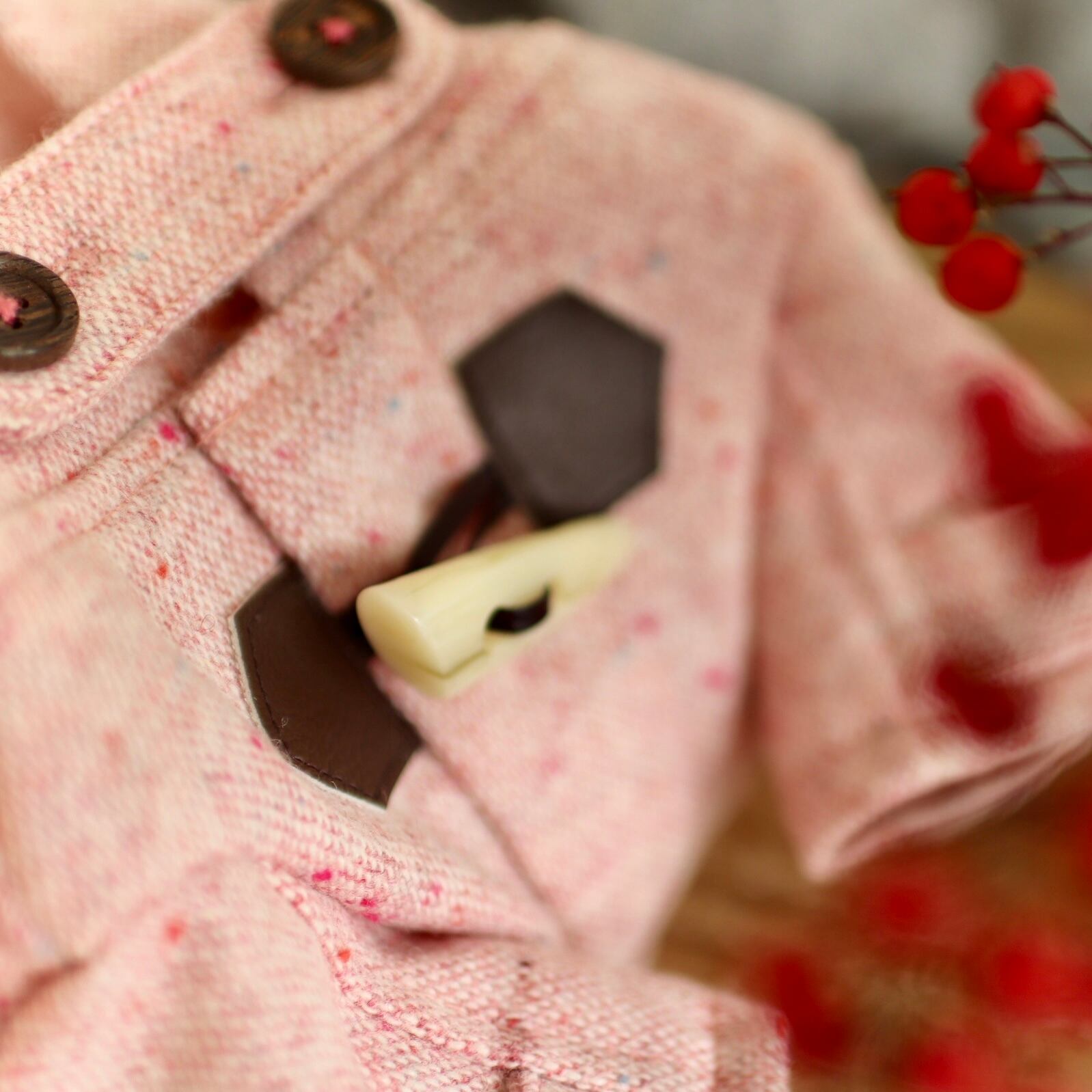 首元とお袖のベルトや、トグル、