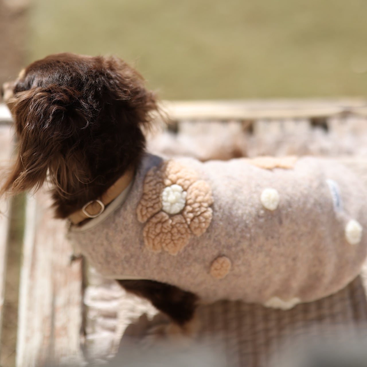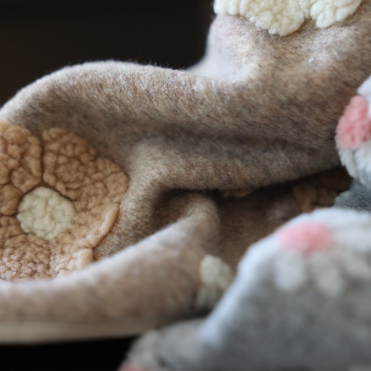 ころんとしたま~るいお花♡ 地のベージュボアは杢になった雰囲気のあるお色味で、毛足の短いタイプ。大きめなお花のボアが浮き出るように咲いていて凹凸が可愛いデザインです。白とベージュの水玉も♪ 内側はベージュでまとめました。