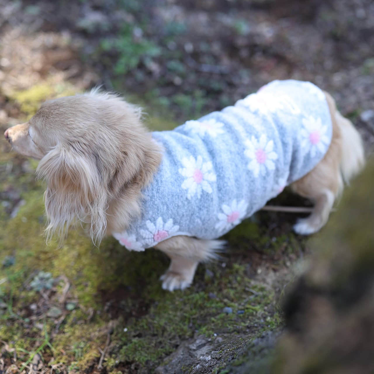 グレーボアにデイジーがたくさん咲いています。白の花びらと可愛らしいピンクの花芯♡ グレーの部分は比較的すっきりとしたコンパクトなボアになっています。春先まで着ていただけそう♪ 内側はグレーでまとめました。